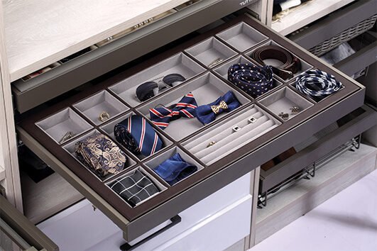מגש נשלף לתכשיטים עם בלימה – מיועד לשליפה מלאה עם סגירה שקטה לנוחות מקסימלית. תומך בעומס של עד 15 ק"ג, עם מידות מינימליות של רוחב 450 מ"מ, גובהתכשיטים 175 מ"מ. המגש מרופד בבד קטיפה לשמירה על התכשיטים.