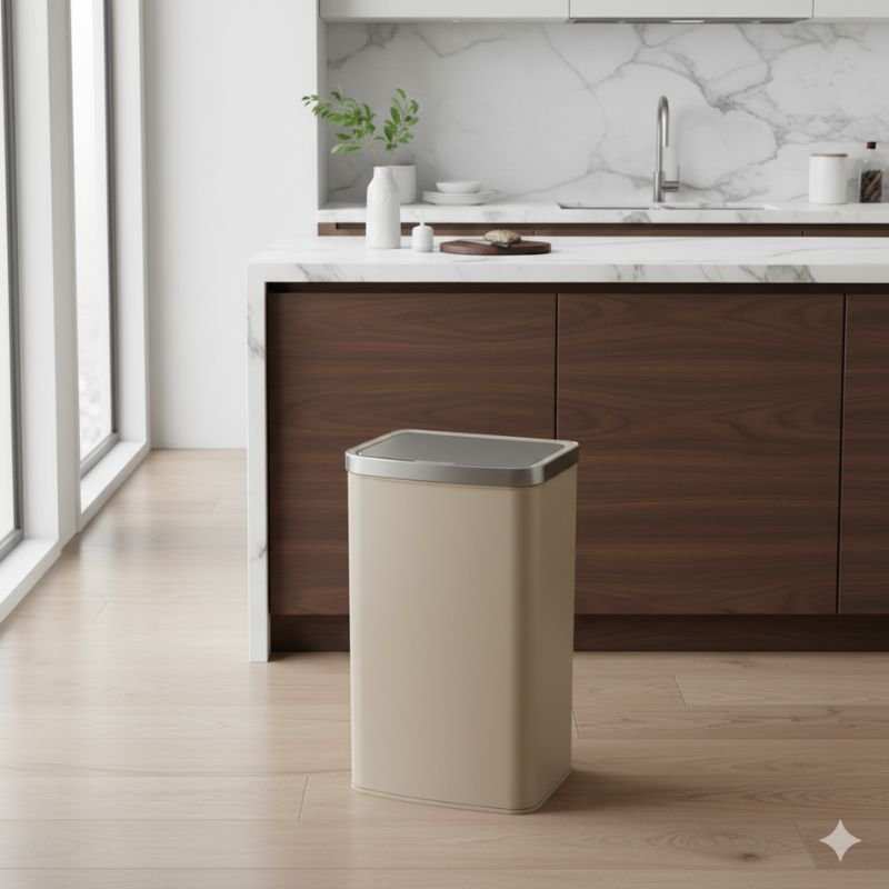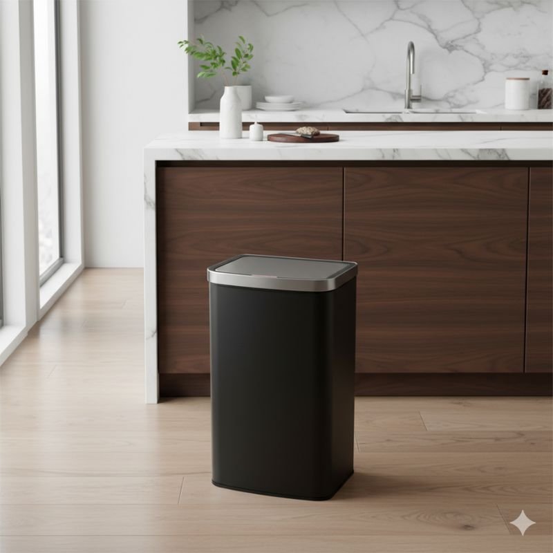 פח אשפה מלבני בנפח 40 ליטר עם מנגנון פתיחה בלחיצה לנוחות מקסימלית. עיצוב מודרני ונקי, זמין בגווני שחור וקשמיר,